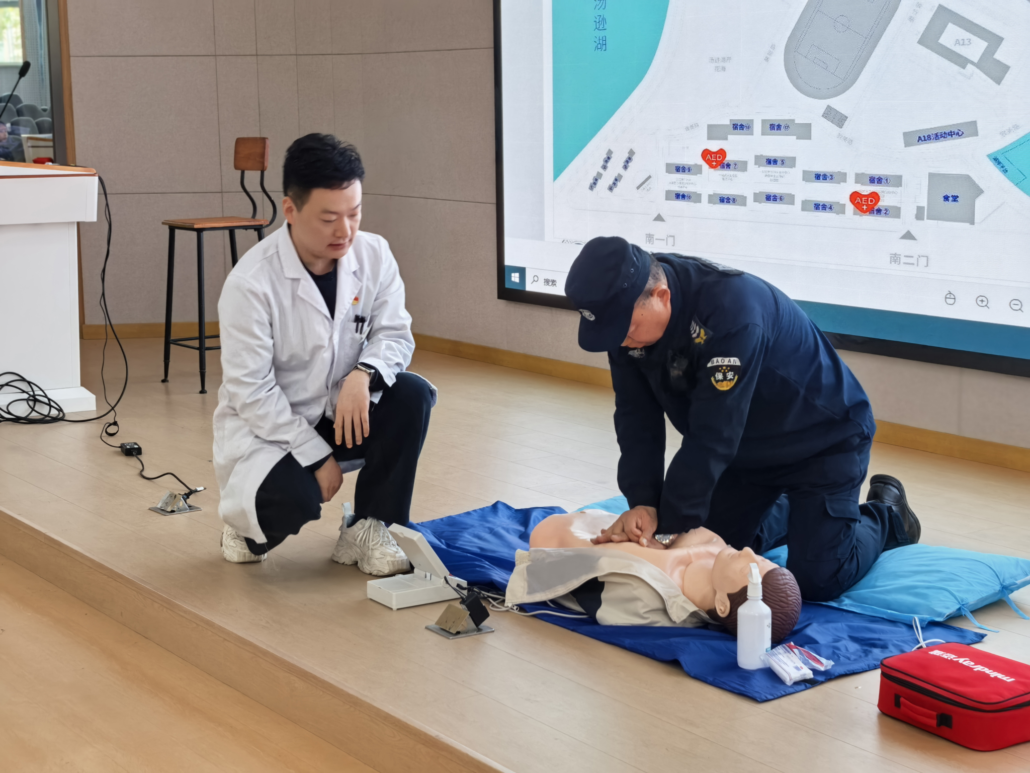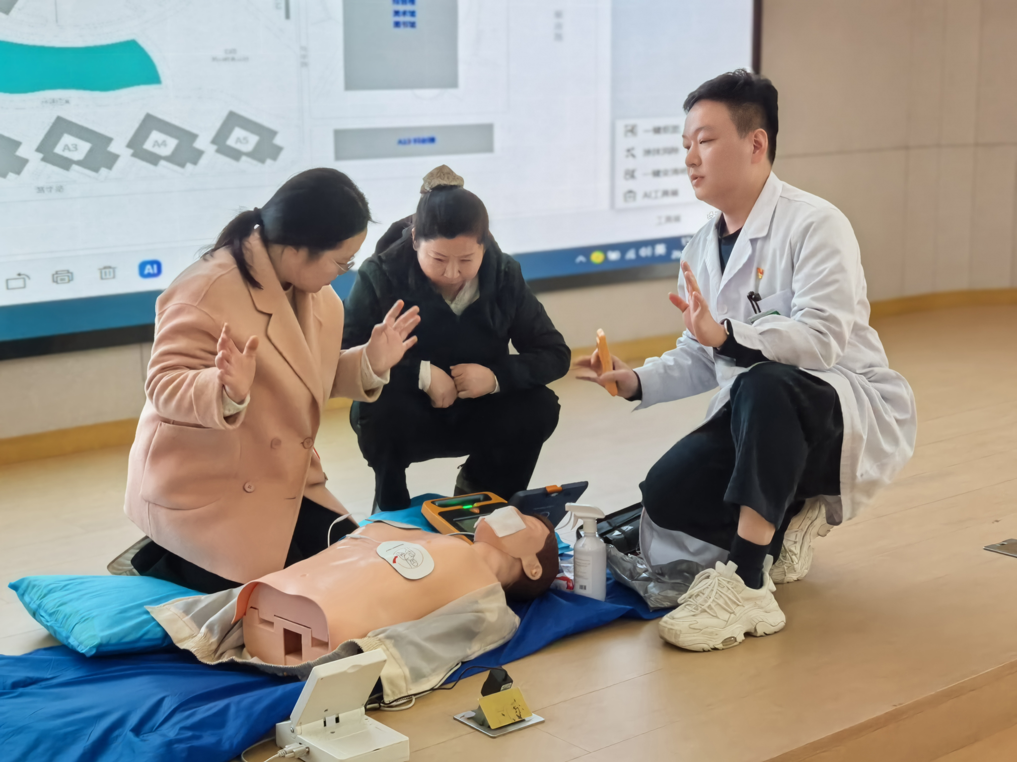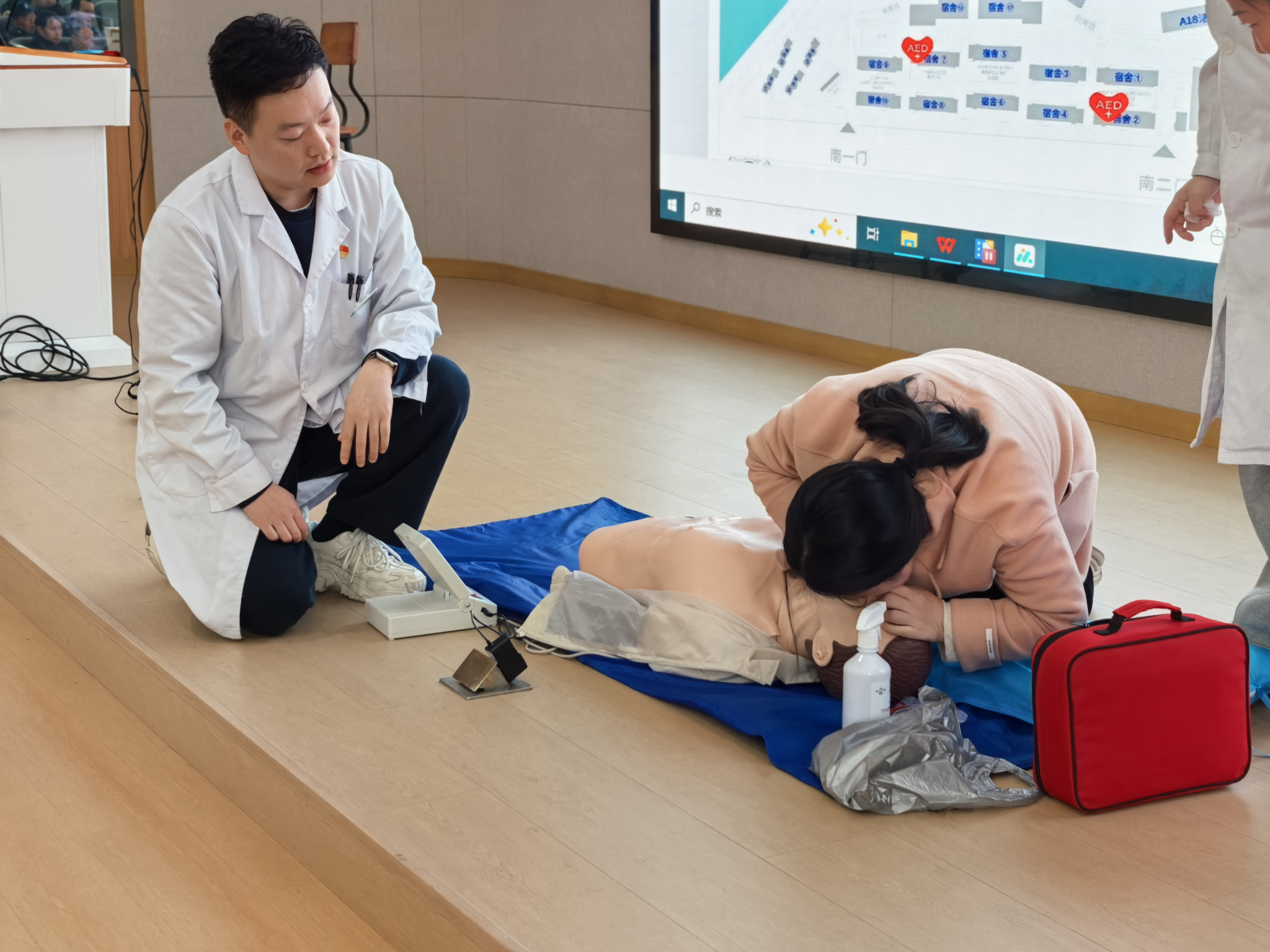 在CPR与AED的理论授课环节,徐医生系统阐释心搏骤停“黄金4分钟”的施救准则,着重强调及时、规范开展急救的关键意义。细致讲解胸外按压的精准位置、按压深度与频率、开放气道的技巧、人工呼吸的规范动作等核心技术,同时完整演示AED从开机、电极片粘贴、心律分析到放电操作的全流程规范,同步提醒操作中的禁忌事项与注意要点,引导参训人员树立科学严谨的急救理念。