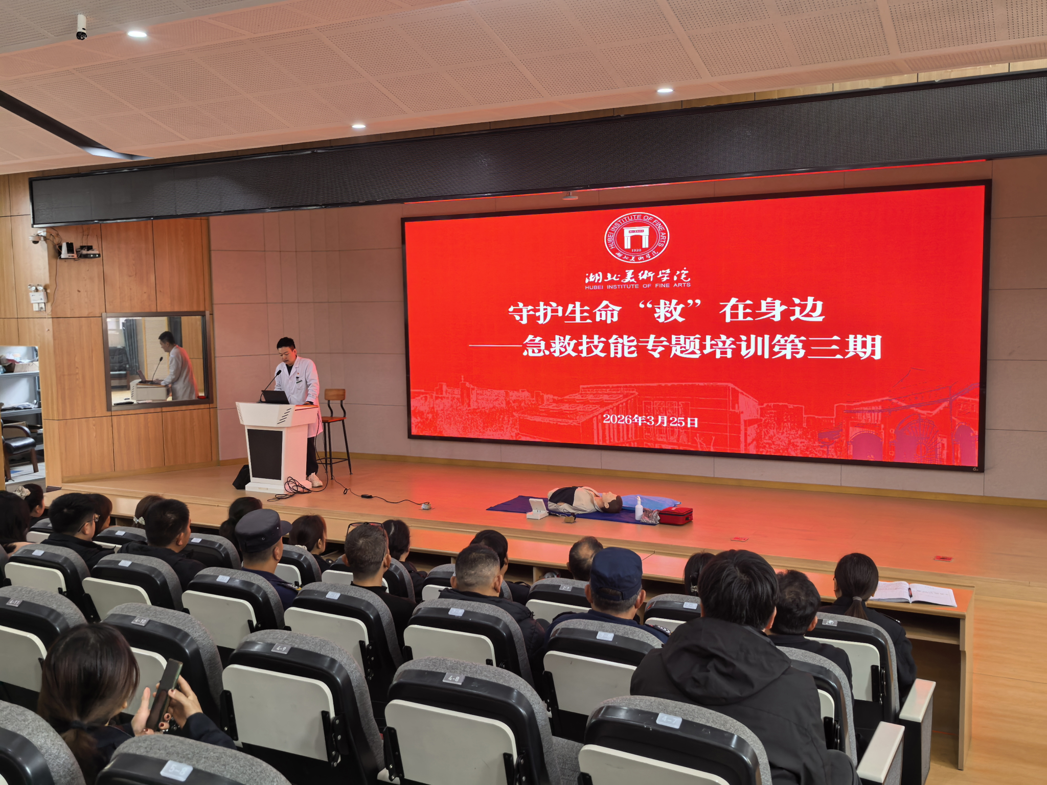 为持续深化健康校园建设,全面普及应急救护知识,切实强化后勤管理处与保卫处重点人员在突发状况下的自救互救与应急处置能力,筑牢校园安全防护屏障,3月25日,校卫生所顺利开展“守护生命‘救’在身边”急救技能专题培训(第三期)——后勤管理处与保卫处重点人员专场。本次培训针对性覆盖学校学生宿舍宿管、教学楼楼管、食堂工作人员及保安,大家积极参与、认真学习,现场学习氛围浓厚,培训效果突出。