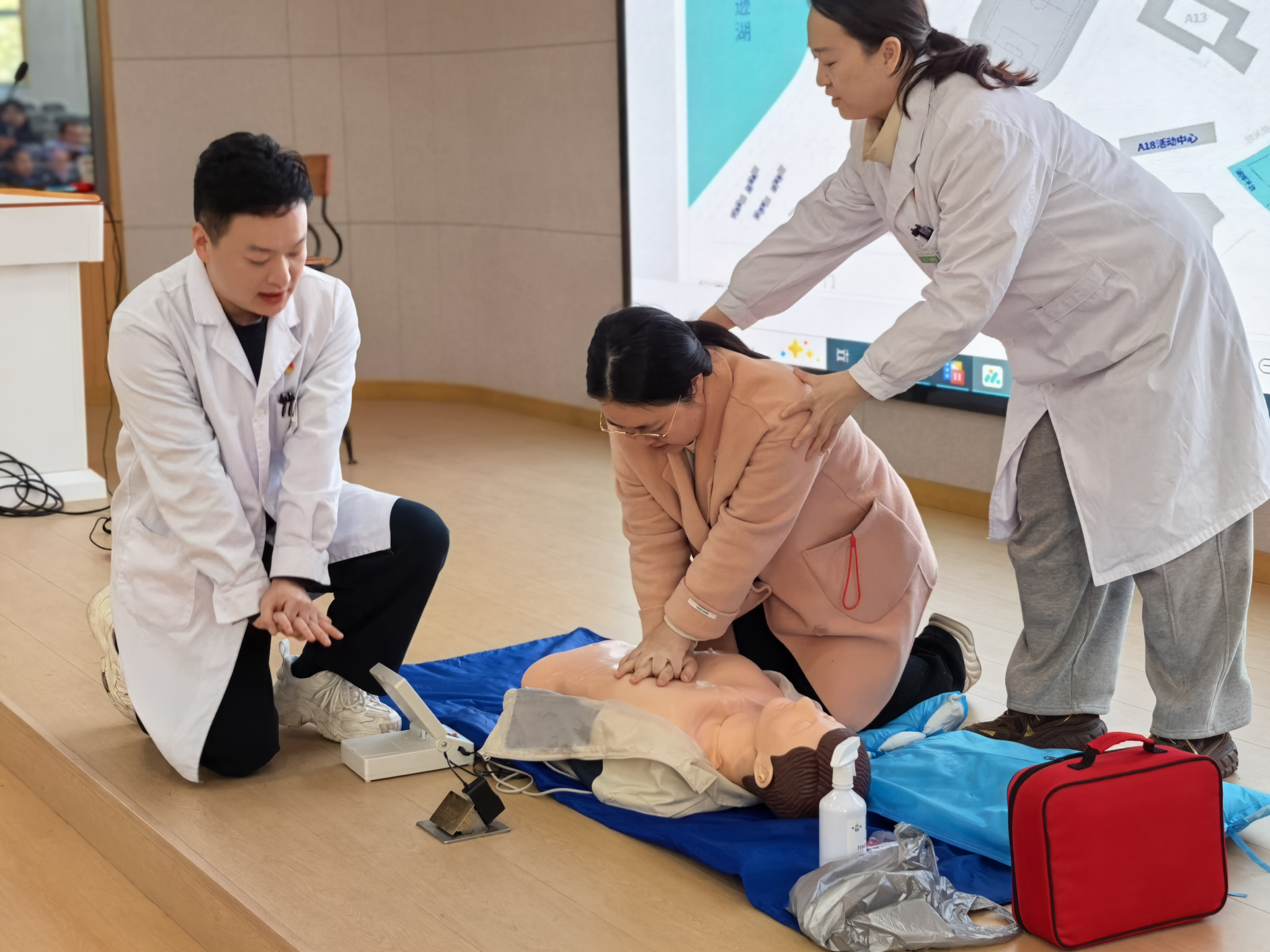 为确保参训人员真正学懂弄通、熟练运用,徐医生与何医生在模拟人上完整还原呼吸心跳骤停患者的急救全流程,同步演示AED除颤与CPR的衔接配合,针对发力方式、按压回弹、吹气有效性等易错环节反复示范强调。实操演练阶段,参训人员主动上前模拟练习,两位医生全程一对一指导,及时纠正动作偏差,确保每位学员精准掌握急救核心要领。